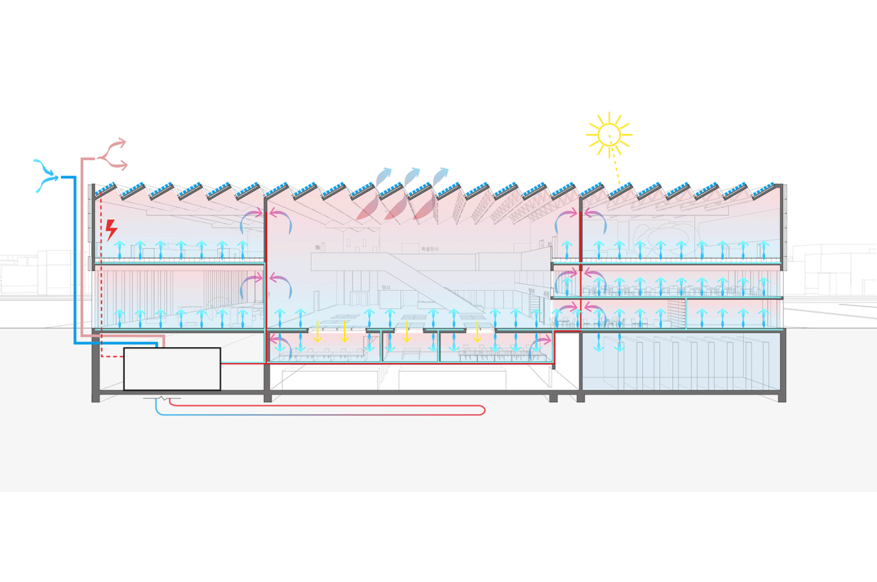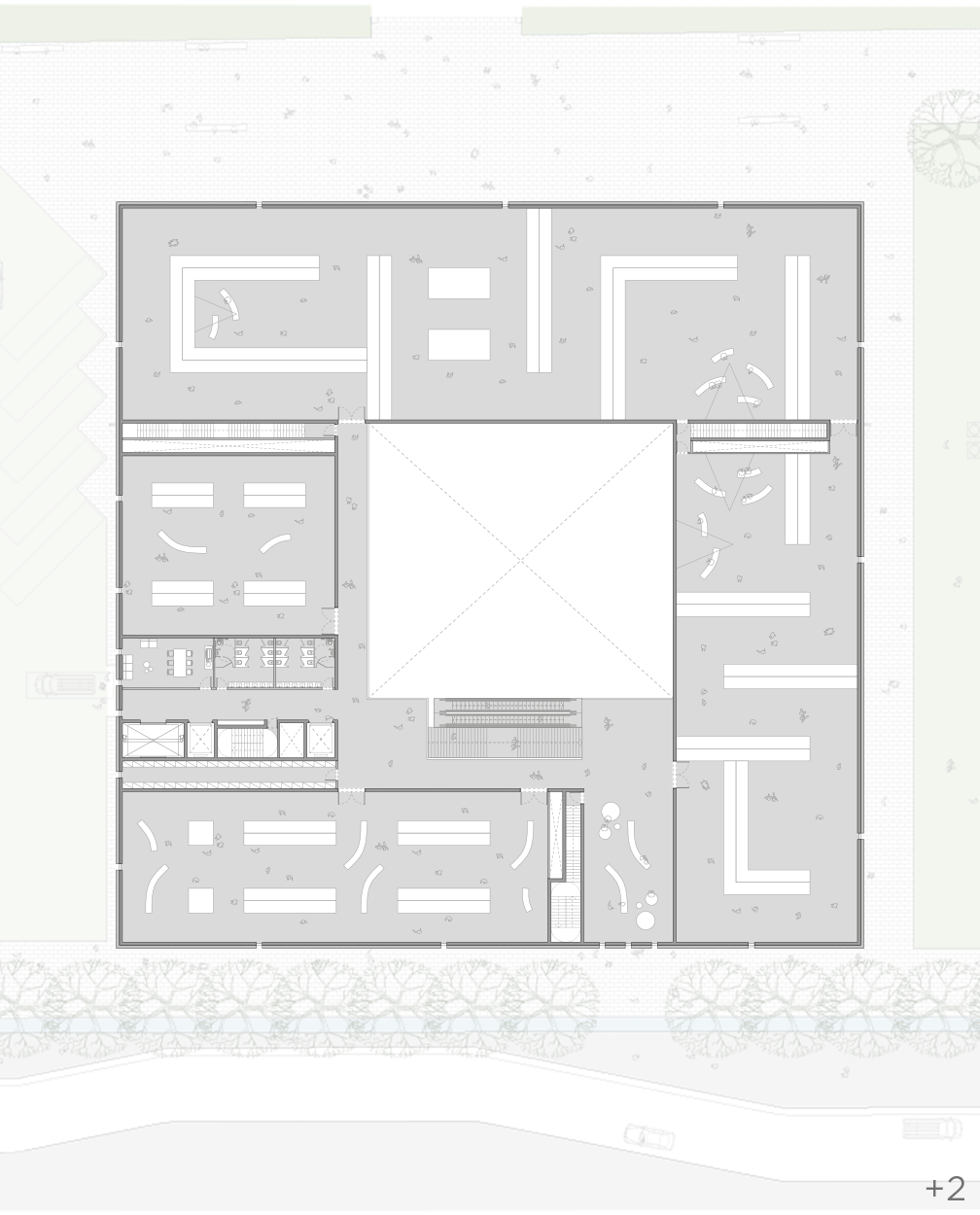 A mezzanine with all management offices will be located above the meeting and service facilities on the ground level, along the West and North faces of the volume.