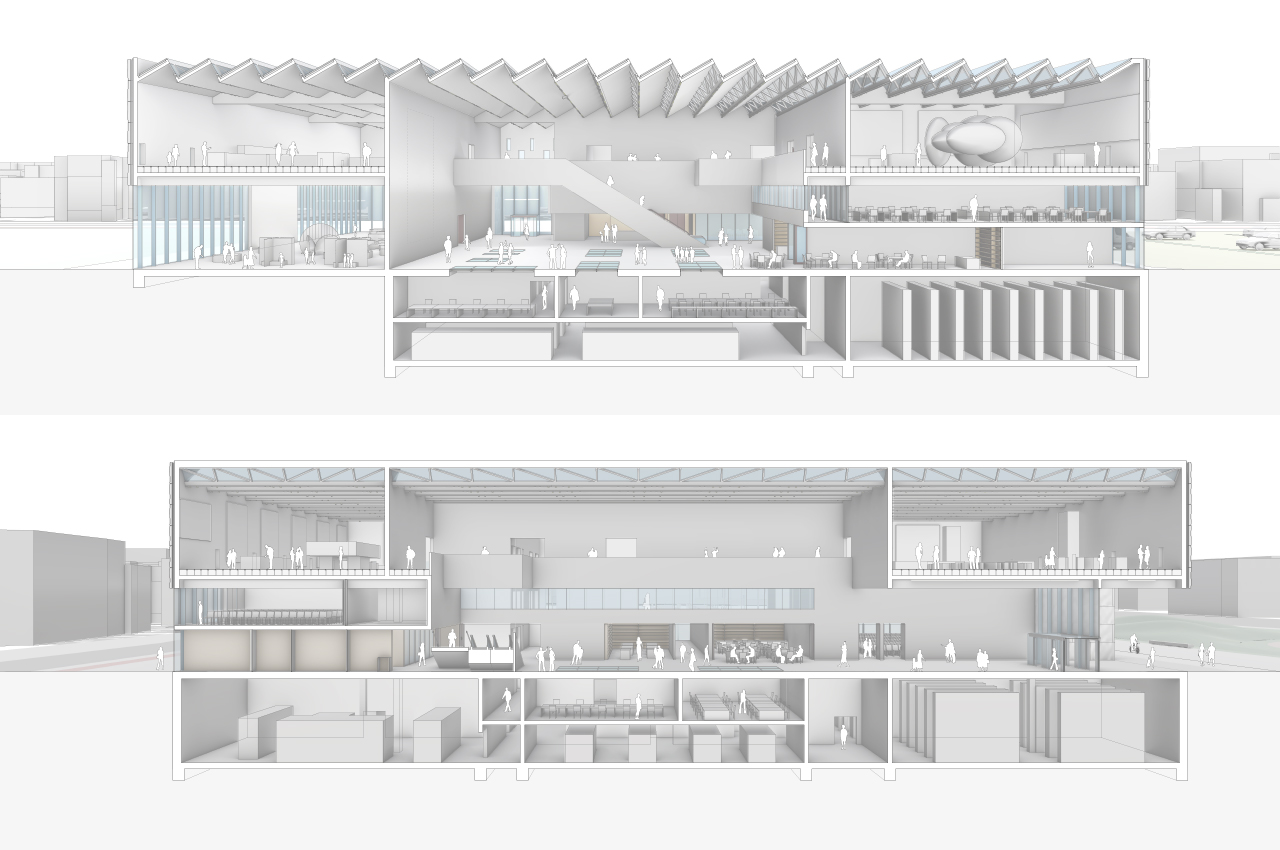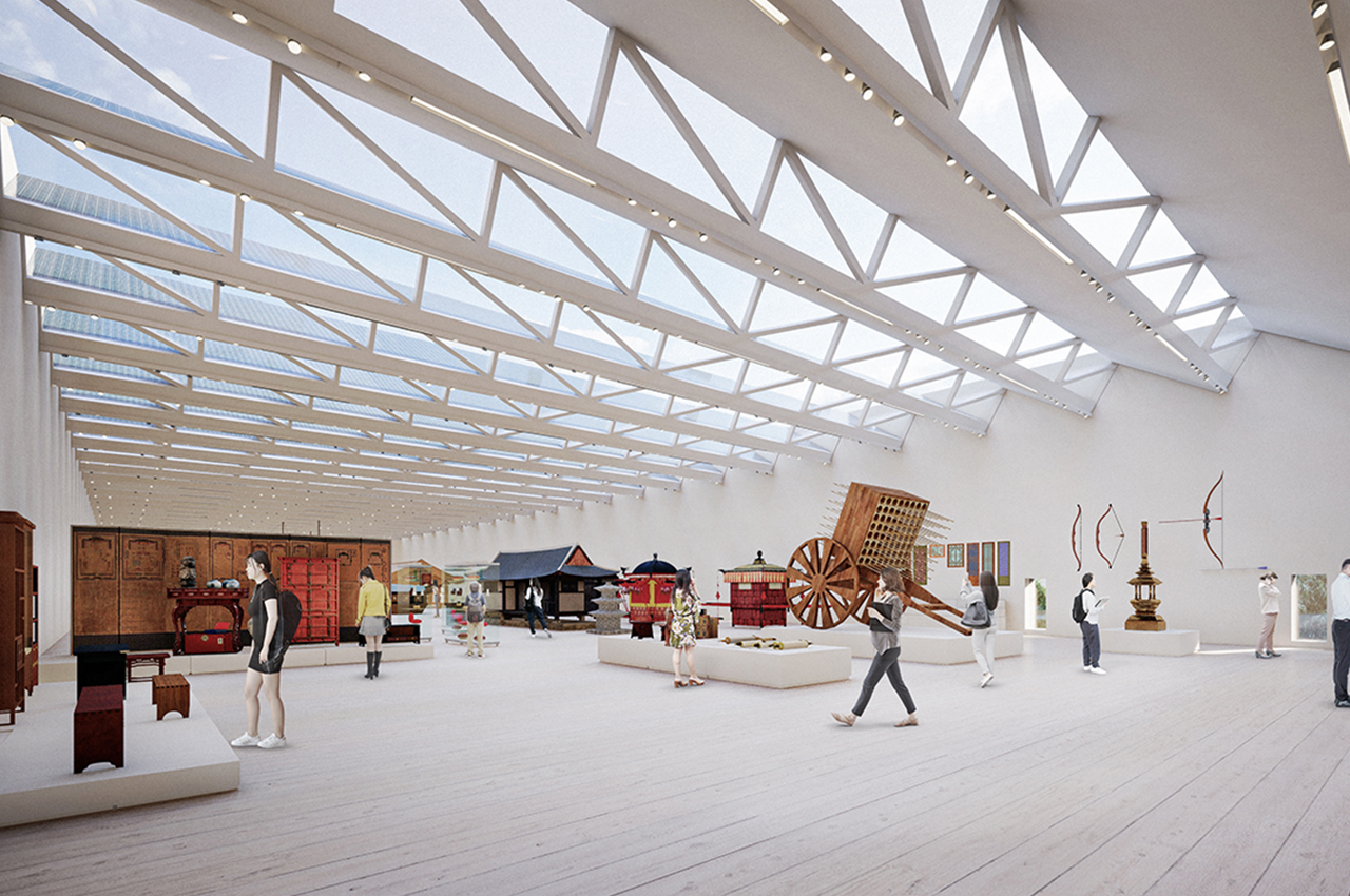 The Museum Galleries are located all on the 1st level and will have zenithal diffuse light from a serrated roof which doubles as a solar farm. The Children’s Museum, Multipurpose Hall, 3D Image Hall, Information Resource Centre, Meetings and Seminars, Restaurant and Shop will be located on the ground level and will be opening, visually and physically, to the surrounding landscape.
