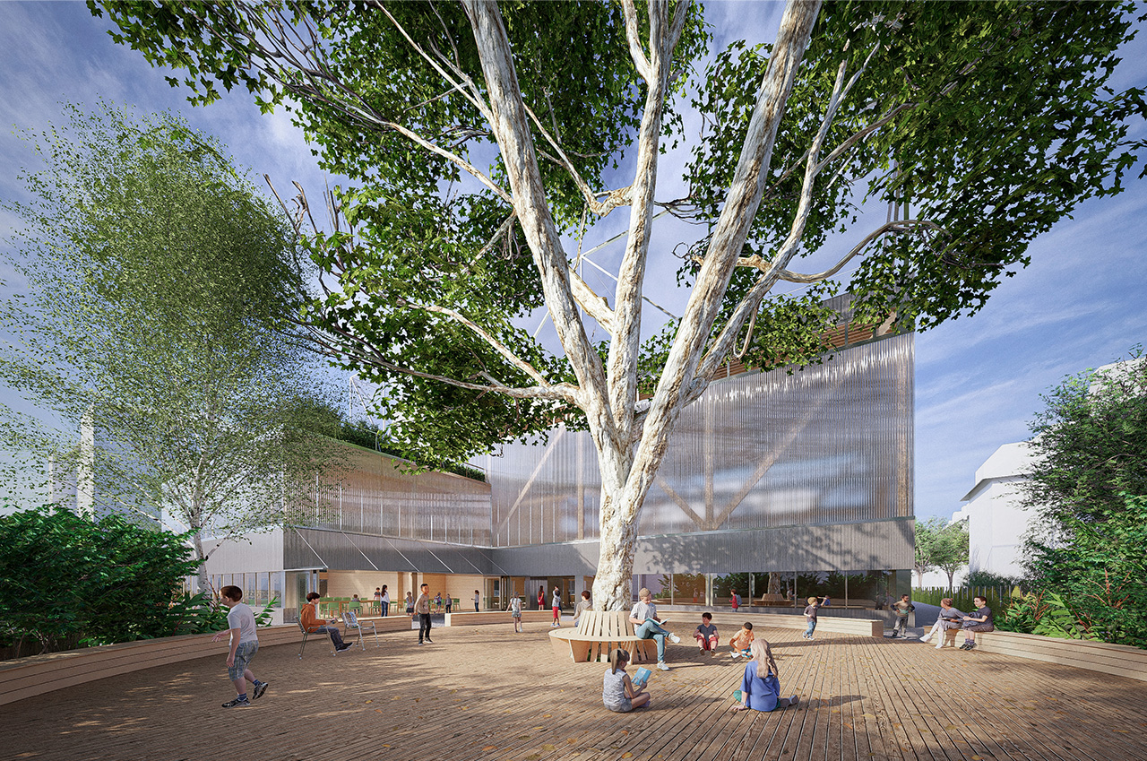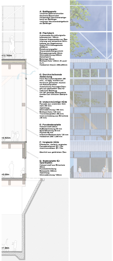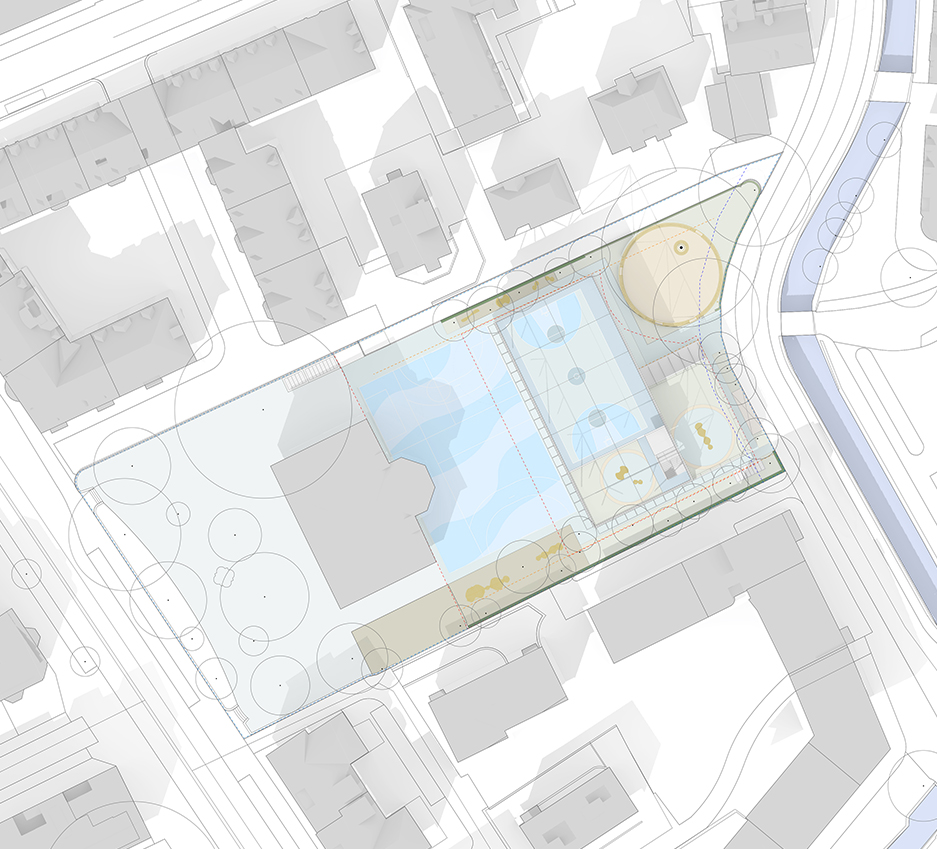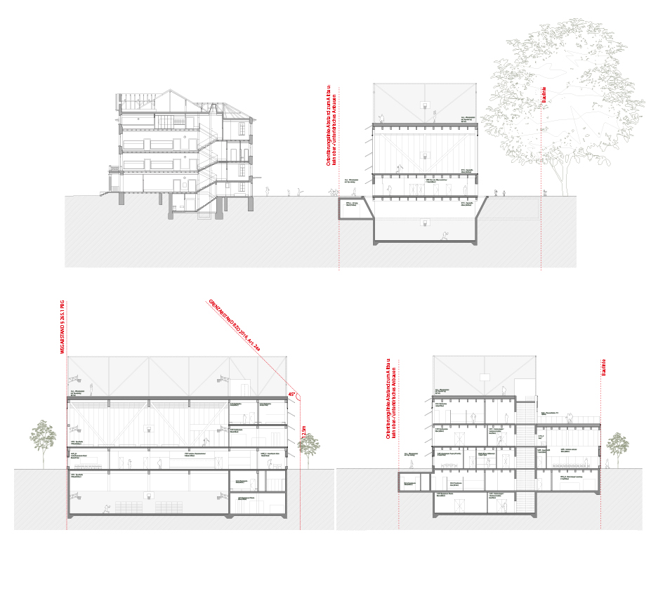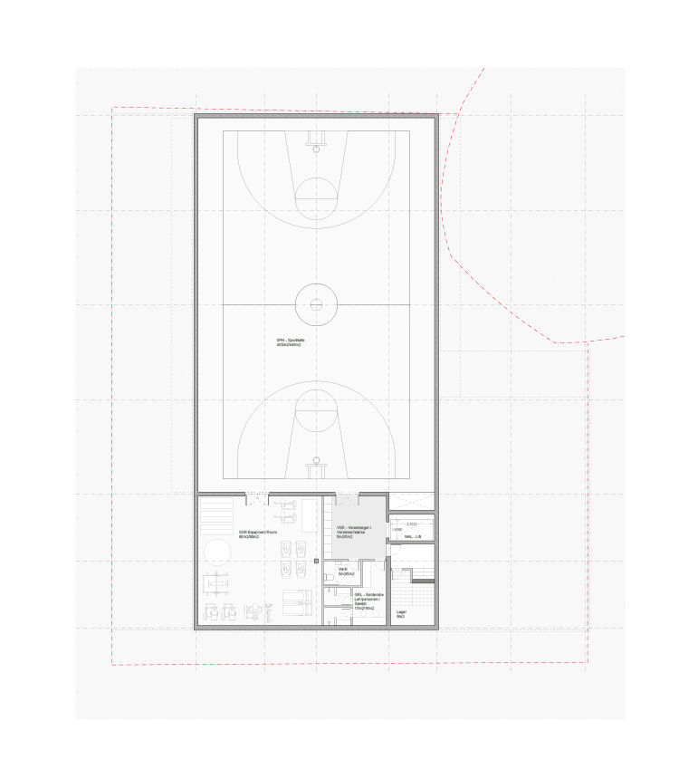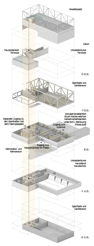 The common service facilities have been distributed by locating the Mensa and the Multipurpose Auditorium on the SE corner, the Music Rooms on the SW corner, the Aufenthalt rooms on the north side, and the offices and administration on the West side, facing the school. The kitchen and logistic area have been located in the midle zone of the East facade, with a logistic access from Wildbachstrasse.